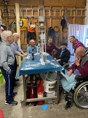 In der Seniorenwerkstatt ging es in den vergangenen Wochen lebhaft und kreativ zu. Über mehrere Nachmittage hinweg entstanden zahlreiche kleine Tannenbäume aus Holz, die nun den Eingangsbereich des Hauses festlich schmücken. Die Bewohnerinnen und Bewohner arbeiteten Schritt für Schritt an den dekorativen Bäumchen: Holzleisten wurden zugesägt, Kanten sorgfältig geschliffen und die einzelnen Teile anschließend zu stabilen kleinen Tannenbäumen zusammengesetzt. Durch die wiederkehrenden Werkstattnachmittage konnte jedes Stück mit Ruhe, Sorgfalt und handwerklicher Erfahrung gestaltet werden.