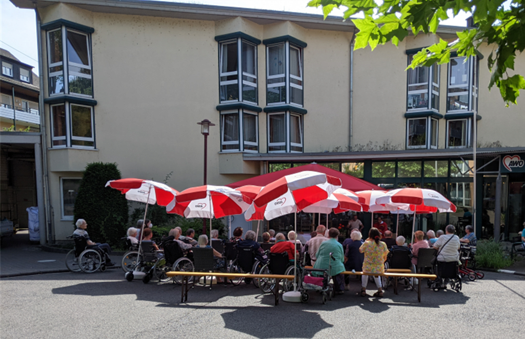 Natürlich hatte sich das Ereignis im Vorfeld herumgesprochen, so dass es sich auch ein Interessierter aus der Nachbarschaft sich nicht nehmen ließ, dem Grillfest einen persönlichen Besuch abzustatten. Dabei wünschte Fredi Winter (Präsidiumsvorsitzender des AWO Kreisverbands Neuwied e.V.) den Teilnehmenden schöne Stunden und viel Vergnügen bei ihrem Aufenthalt auf der Terrasse der Wohnresidenz.