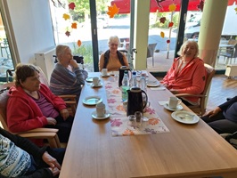 Beim gemeinsamen Mittagessen sowie nachmittags bei Kaffee und Kuchen ist Zeit für Austausch und Geselligkeit. Der Ruheraum und auch der schön angelegte Außenbereich bieten Gelegenheiten zum Rückzug, Entspannung und Erholung.